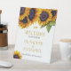 Personalised rustic modern elegant wedding welcome sign featuring beautiful yellow gold sunflowers bouquets with natural green foliage and two little golden hearts and a faux gold chic typography script. ++++++++++++++ Easy to customise with the bride and groom names, date and place. +++++++++++++ Suitable for summer or autumn fall outdoor garden or backyard wedding ceremonies and receptions.
