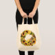 A Beige Grocery Tote For Shopping Designed In A Wreath Of Sunflowers and Bee Hive
