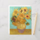 Sunflowers (1889) Vincent van Gogh. Still life on a blue background. A bright bouquet of sunflower flowers stand in a vase. Reproduction of famous works of art images in the public domain.