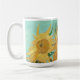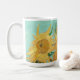 Sunflowers (1889) Vincent van Gogh. Still life on a blue background. A bright bouquet of sunflower flowers stand in a vase. Reproduction of famous works of art images in the public domain.