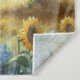 This tapestry has a watercolor landscape that shows a field with sunflowers with trees and mountains.