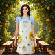 An ivory coloured background decorated with a pattern of yellow sunflowers, peach and blue flowers. Personalise and add a name and text. Kitchen utensils are framing the name.