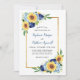 These wedding invitations feature a modern floral design with sunflowers, hydrangeas and navy blue roses with a faux gold border. Personalise them with your own text.