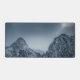 Cold and cloudy day at the snowy mountains with just a hint of sunlight through the clouds.