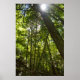 Sunlight filters through a dense forest canopy, illuminating layers of branches and leaves from below. The upward perspective captures the height and depth of the trees, creating a natural sense of immersion in the woods.