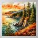 Vibrant watercolor painting of a forested coastline with tall trees and rocky cliffs, bathed in warm hues of the setting sun, embracing the serene beauty of nature and tranquillity of the sea.