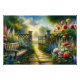 Step into a storybook moment with this enchanting garden scene, where soft golden sunlight filters through lush trees and spills across a cobblestone path leading to a welcoming open gate. Bursting with vibrant cottage blooms—dahlias, hollyhocks, foxgloves, and delphiniums—the garden brims with life and color, painted in soft pinks, sunny yellows, and deep corals that blend seamlessly with cool lavender and sky blues. A rustic wooden bench nestled among the flowers invites quiet reflection, while dappled light and painterly textures evoke a peaceful, whimsical mood. The overall style is dreamlike and romantic, steeped in cottagecore nostalgia and wrapped in the cozy serenity of an early morning bloom. AI generated artwork.