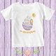 Cute baby shirt with sweet Easter graphics and editable text caption. Has a soft pastel image of a baby bunny in an Easter egg shell with a fat carrot and a smiling sun face..
