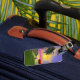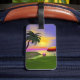 Luggage tag with my artwork of a tropical green island with a palm tree, colourful beach umbrella, beach ball and a yellow sun in the blue sky with a touch of pink in the horizon.