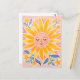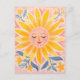 Brighten someone's day with this delightful postcard featuring a whimsical sunflower with a serene, smiling face. Painted in vibrant yellows and soft pinks, this artwork is a burst of joy and warmth. It's perfect for sending sunny wishes, thank you notes, or just as a cheerful addition to any collection of nature-inspired art.