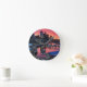 The clock did not take as long to arrive as I thought it might and was extremely well packaged. I didn't do the measurements so I didn't realize it is a little smaller than the average clock but that does not matter (just make sure you check if that's important to you).It is really nifty! It seems very solid and well made not flimsy at all. It has been going well and has kept good time in its few weeks on my wall. Nice product. Gets noticed too! Nicer in real life than the picture but true to the picture