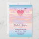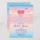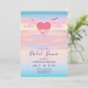 Lovely personalised invitation in soft pastel colours. The romantic landscape of the sunrise with a pink sun in the form of a heart. Classy seashore setting for that perfect beach wedding or destination island wedding.