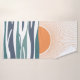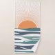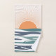 Abstract illustration of sunrise with orange sun and blue, white and turquoise sea waves decoration