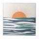 Abstract illustration of sunrise with orange sun and blue, white and turquoise sea waves decoration
