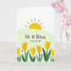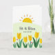 This design shows a pale green hillside topped by a bright golden half-sun with thin rays reaching into a white sky, like the start of a new morning. Centered on the hill, the words “He is Risen” appear in flowing cursive-style lettering, with “ALLELUIA!” set just below in a simpler, all-caps style. The text is dark and easy to read against the soft green, standing close together like two lines meant to be read as one message. Along the bottom edge, a row of upright yellow spring flowers with green stems leans gently toward one another, giving the scene a friendly, close-knit feel 🌷. Each flower has slightly darker shading on the petals, adding a soft sense of depth while keeping the shapes simple. Tiny red star-like marks are sprinkled between the flowers, like small accents that echo little shared glances in a crowd 🐇. The lower foreground is filled with these yellow blooms and green leaves, dotted with the small red accents beneath the centered lettering.