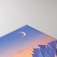 A breathtaking mountain range bathed in the warm glow of sunrise or sunset. The scene is dominated by a deep blue sky, punctuated by a crescent moon. The mountains themselves are majestic, with snow-capped peaks and rugged terrain. A layer of clouds adds depth and mystery to the landscape.