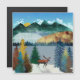 A beautiful landscape with unique colours and textures showing a mountain and lake landscape and multi-coloured forest with a rising sun and a moose in shades of blue, green, gold, and magenta.