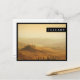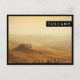 Postcard of a sunrise over the famous Podere Belvedere villa in a landscape with barren, rolling hills in the Val d'Orcia in Tuscany, Italy with a black edge and the text: 'Tuscany'.