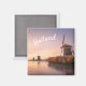 Photo magnet with a landscape with a row of three traditional windmills and reeds along a frozen river during a colourful sunrise in winter in Leidschendam in the Netherlands with in white the text 'Holland'.