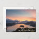 Postcard of a colourful sunrise over Lake Bled with the island in the early morning in Slovenia with the text: 'Slovenia'.