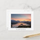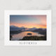 Postcard of a colourful sunrise over Lake Bled with the island in the early morning in Slovenia with a white border and the text: 'Slovenia'.
