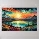 The Sun Rises above a lake in the Mountains, as it shares the sky with the Moon. Colourful landscape and sky.