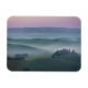 Rectangular souvenir photo magnet with a foggy sunrise with a pink sky and mist between the Tuscan hills over agriturismo podere il Belvedere farmhouse in the Valdorcia (Orcia Valley) between Pienza and San Quirico in Tuscany, Italy.