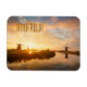 Rectangular souvenir photo magnet with a vibrant sunrise over a row of windmills and reflection in the water of the river on a beautiful morning in a countryside landscape in Kinderdijk in the Netherlands with the text 'Kinderdijk, Holland'.