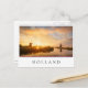 Photo postcard of a vibrant sunrise over a row of windmills and reflection in the water of the river on a beautiful morning in a countryside landscape in Kinderdijk in the Netherlands with a white edge and in a white box the text 'Holland'. It has stripes in red, white and blue, the colours of the dutch flag.