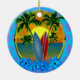 Beautiful beach sunset behind surfboards and palm trees, framed with bamboo and hibiscus flowers. Ocean blue background with pink Hawaiian Honu Sea Turtles and Tiki Masks.