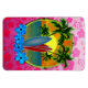 Beautiful beach sunset behind surfboards and palm trees, framed with bamboo and hibiscus flowers.With a pink background of Hawaiian Honu Sea Turtles and hibiscus flowers.