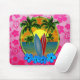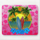 Beautiful beach sunset behind surfboards and palm trees, framed with bamboo and hibiscus flowers.With a pink background of Hawaiian Honu Sea Turtles and hibiscus flowers.