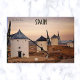 This postcard features windmills in Consuegra, Spain. Located in the province of Toledo, Castile-La Mancha, Spain, Consuegra is a municipality and in 2018, it had a population of 10,098 inhabitants. It is 80 km from Ciudad Real and 60 km from Toledo. Consuegra is located in La Mancha region, famous for its extensive dry plains, vineyards and historical constructions such as windmills. Massimo Frasson from Italia, CC BY-SA 2.0 <https://creativecommons.org/licenses/by-sa/2.0>, via Wikimedia Commons