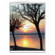 A romantic sunset at the lake, in which those is reflected orange sun between two black trees.