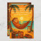 The front showcases a peaceful beach scene with a happy retiree relaxing in a hammock between swaying palm trees, watching a golden sunset over turquoise waters. Symbolic elements include a vintage suitcase with travel stickers, an hourglass, and leisure items representing the freedom of retirement.