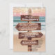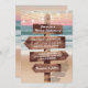 Romantic ocean wedding invitations featuring a lush sunset sandy beach, string twinkle lights and your wording written on a rustic wooden signpost.