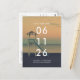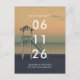 Sunset beach design with a wooden lifeguard stand on the sand save the date postcards. Customise with your wedding details and then mail them to your guests.