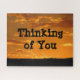 Give someone a challenge with this sunset photo puzzle. The landscape in silhouette appears at the bottom with the bright orange sky making up the majority of this photo. Long horizontal clouds are illuminated by the setting sun and provide a beautiful backdrop for "Thinking of You". The puzzle comes in a variety of sizes perfect for your gift giving needs.
