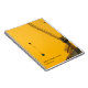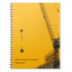 A minimal construction-themed notebook featuring a simple black and yellow monochrome design. It features a construction crane silhouetted towards the foreground with a simple company signature towards the lower corner.