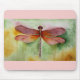 Original watercolor painted design by Sandra Gale featuring a whimsical dragonfly in soft shades of muted oranges, pinks and gold on a pale green background. Great soft design for anyone who loves dragonflies, gardens and summer sunset colours.