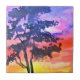 Beautiful colourful landscape sunset dreaming painting by artist Sacha Grossel of a red yellow and purple sunset landscape in the outback with a tree shadow in the foreground. Colourful original art in watercolor style.