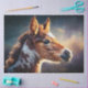 This dreamy sunset foal portrait captures the soft, painterly beauty of a baby horse standing in the evening light. Warm chestnut and white fur, tiny curls along the mane, and a glowing pastel sky in the background give this artwork a tender, storybook feel perfect for horse lovers of any age.