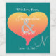 Romantic heart with sunset shades of golden yellow orange to pink on a teal green background. Personalise with the bride and groom's first names inside the pretty heart. Personalise with the wedding date underneath the heart in white text, and the couple's monogrammed initial in silver text. Original Artwork by TamiraZDesigns. www.zazzle.com/tamirazdesigns
