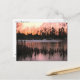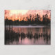 This artistic postcard displays an abstract, impressionistic interpretation of sunset over a pond. Most of the winter ice has melted to reflect the lovely colours of orange, salmon, yellow, purple and gold. The surrounding trees are in black silhouette.
