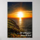 The image captures a breathtaking sunset over the ocean, with the sun descending towards the horizon and casting a golden glow across the water. The rocky shoreline, adorned with vegetation and wildflowers, stretches into the sea, creating a vibrant contrast between land and water. The sky is filled with wispy clouds that catch the last rays of sunlight, creating a warm and serene atmosphere.