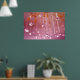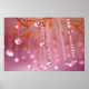 A 3D macro shot of a crystal chandelier. Myriads of strands of sparkling glass beads catch the light to create a lovely bokeh in the background. The blurred glass drops are reflected clearly in the sharply focused crystal balls in the foreground. The gold branches of the candelabra and soft pink atmosphere and lights give a sunset glow to the piece. Created in Vue.