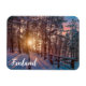 Sunset in snowy pine forest with sun ray magnet