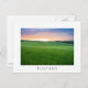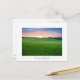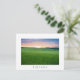 Postcard of a landscape with the rolling fields with green wheats at sunset in the Val d'Orcia valley in Tuscany, Italy with a white border and the text: "Tuscany".