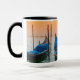 Peaceful setting next to the Doge's Palace in Venice, Italy, with four gondolas, all together pointing to a beautiful misty sunset.