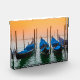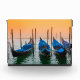 Peaceful setting next to the Doge's Palace in Venice, Italy, with four gondolas, all together pointing to a beautiful misty sunset.